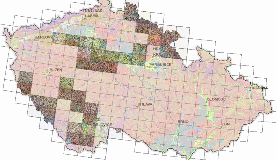 Ukázka kladu listů půdní mapy České republiky 1 : 50 000 (Barevné čtverce jsou rastrové půdní mapy).