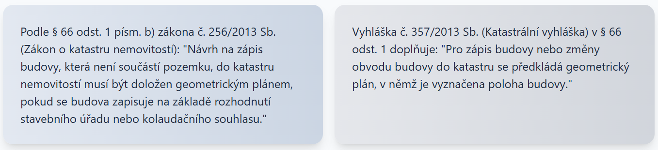 Účel geometrického plánu spočívá v přesném geodetickém zaměření skutečného provedení stavby a jejím správném zobrazení pro potřeby katastru nemovitostí. GAD zajišťuje, aby údaje v katastru odpovídaly skutečnému stavu v terénu, což je zásadní pro právní jistotu vlastníků nemovitostí. Bez tohoto dokumentu nelze provést zápis nové stavby do katastru, což znamená, že stavba zůstává právně neexistující pro účely vlastnických vztahů.
