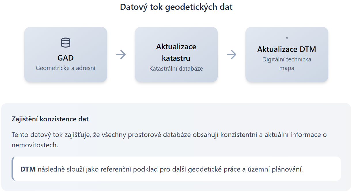 Geometrický plán, katastr nemovitostí a digitální technická mapa tvoří vzájemně propojený systém správy prostorových dat o nemovitostech. GAD slouží jako klíčový dokument pro aktualizaci katastru nemovitostí, který následně poskytuje data pro aktualizaci Digitální technické mapy ČR. Tento proces zajišťuje konzistenci a aktuálnost všech prostorových databází.