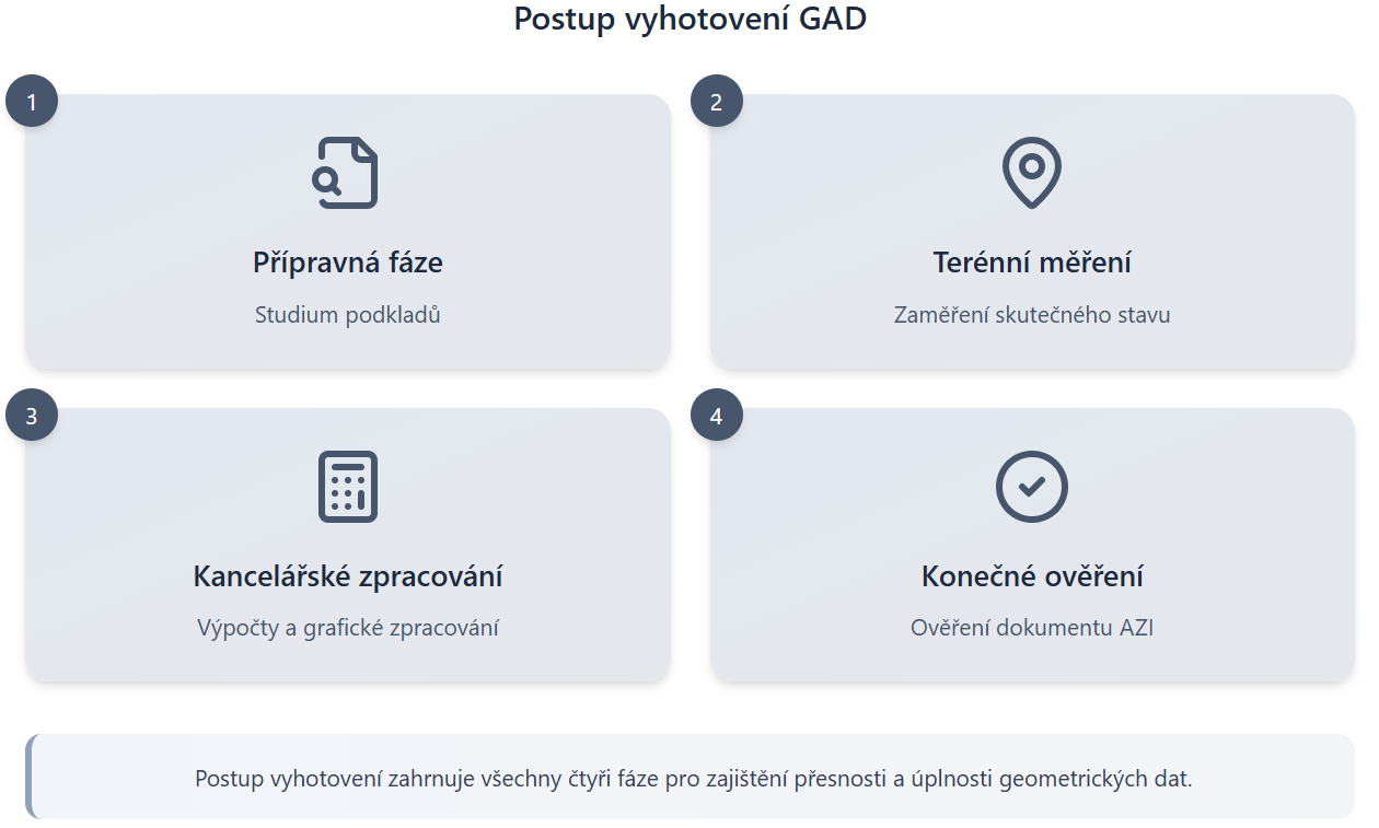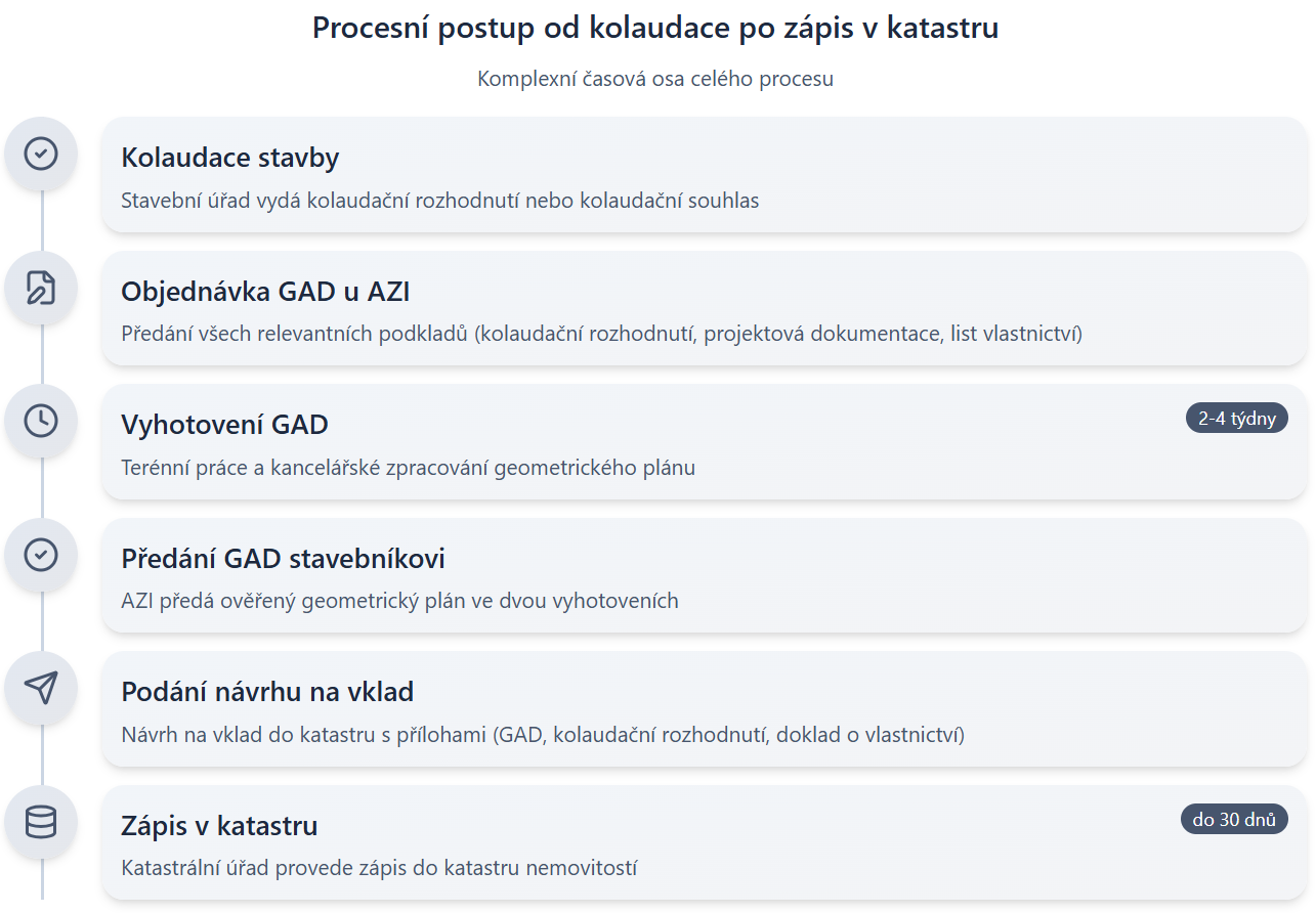 Vyhotovení GAD obvykle trvá 2-4 týdny v závislosti na složitosti stavby a aktuální vytíženosti AZI. Po dokončení terénních prací a kancelářského zpracování předá AZI stavebníkovi ověřený geometrický plán ve dvou vyhotoveních.