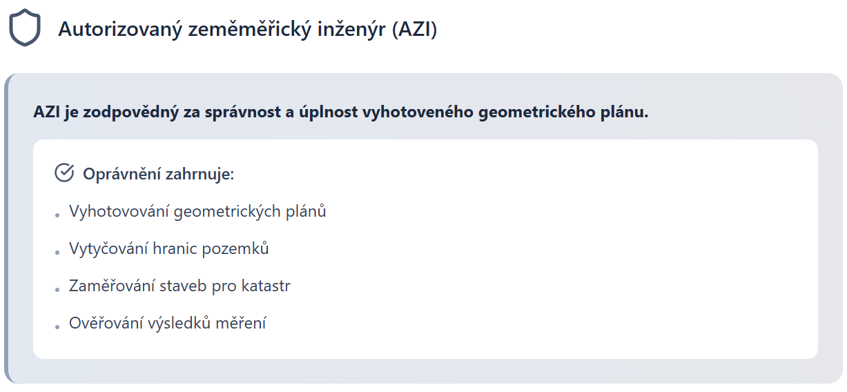 Autorizovaný zeměměřický inženýr (AZI) je klíčovou osobou celého procesu vyhotovování geometrického plánu. Jedná se o odborníka s platnou autorizací podle zákona o zeměměřictví, který nese plnou odpovědnost za správnost a úplnost vyhotoveného dokumentu.