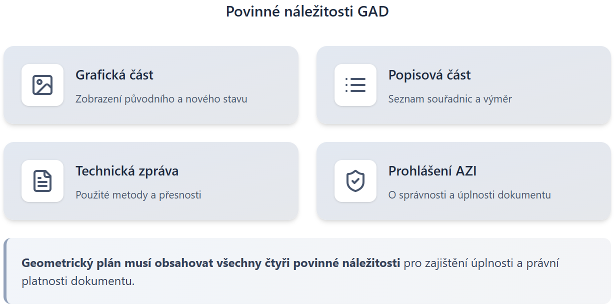Zákon přesně definuje, co musí geometrický plán obsahovat, aby byl akceptovatelný pro zápis do katastru nemovitostí. GAD musí obsahovat záhlaví s názvem "GEOMETRICKÝ PLÁN", číslem plánu, označením katastrálního území, obce a okresu. Grafická část představuje srdce celého dokumentu a musí v odpovídajícím měřítku mapy (obvykle 1:500 nebo 1:1000) zobrazit jak původní stav před realizací stavby, tak nový stav po jejím dokončení, přičemž všechny změny musí být jasně vyznačeny.