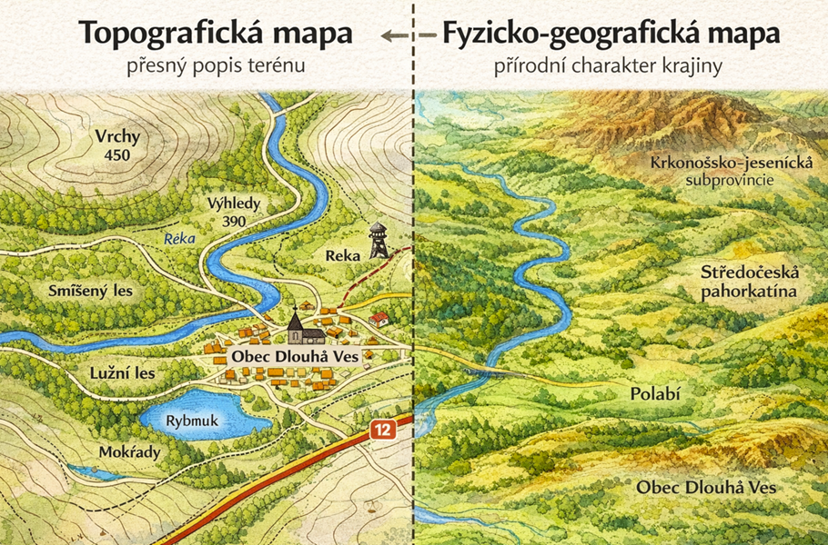 Fyzicko-geografická mapa se zaměřuje výhradně na přírodní složky krajiny. Zobrazuje georeliéf (pohoří, nížiny, vrcholy), hydrografii (řeky, jezera, vodní plochy), geologické podloží a klimatické charakteristiky. V České republice tyto mapy detailně zachycují například Český masiv, Karpaty, povodí Labe, Moravy a Odry, či rozložení různých půdních typů.